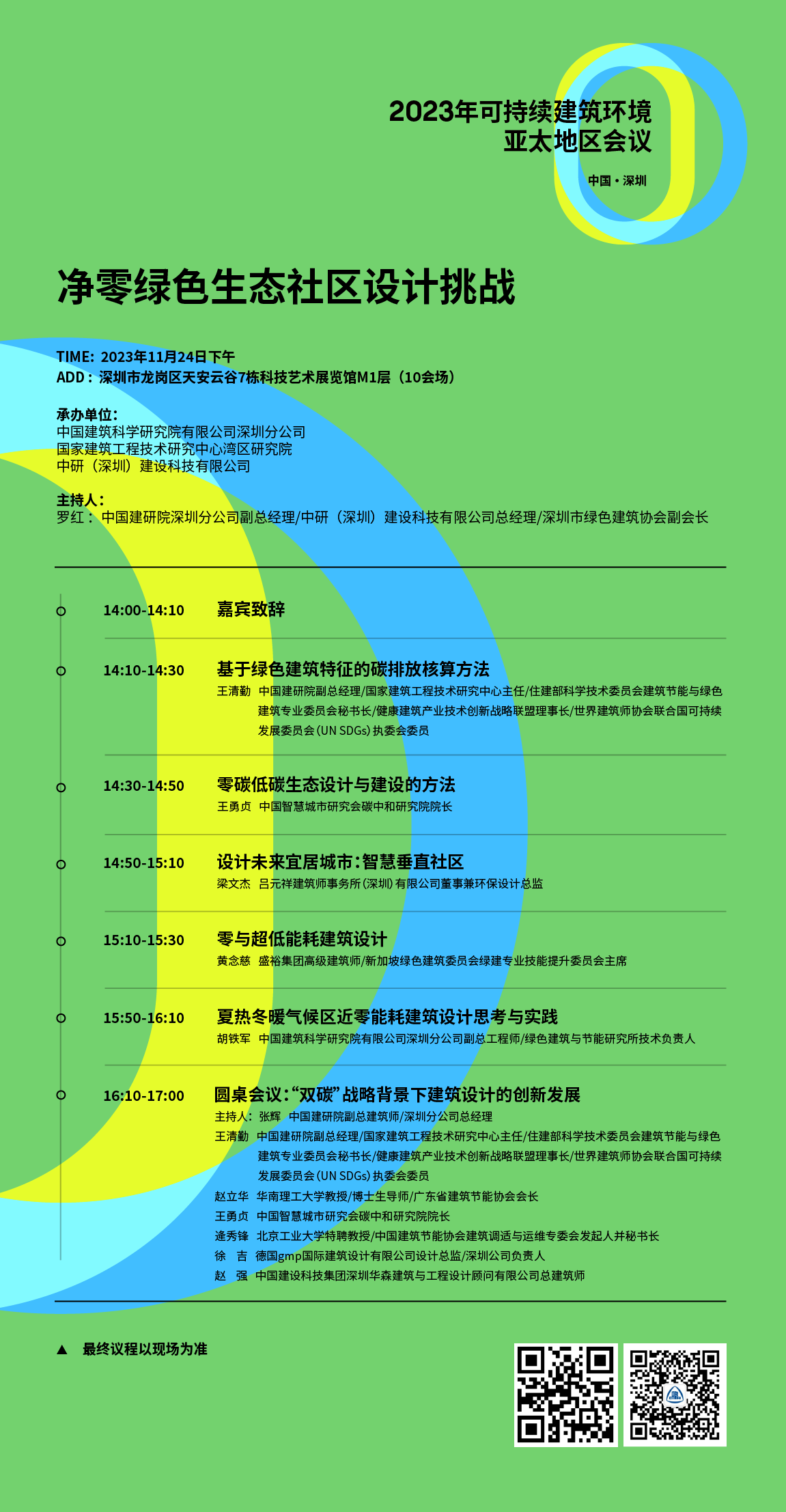 本次大會(huì)以“發(fā)展綠色建筑,創(chuàng)建凈零地球(Creating Net Zero Earth!We think!We Act!)”為主題,重點(diǎn)策劃了包括大會(huì)開(kāi)幕式、主論壇、綜合論壇、十五場(chǎng)分論壇、三場(chǎng)中外平行會(huì)議、閉幕式等活動(dòng)內(nèi)容,將匯聚亞太地區(qū)乃至全球建設(shè)行業(yè)的專家學(xué)者和精英人士,集思廣益,聚焦碳中和與氣候適應(yīng)性、近零碳城市、近零能耗建筑、建筑低碳方法與工具、市場(chǎng)與政策、綠色建筑高質(zhì)量發(fā)展等系列主題展開(kāi)深入研討交流。