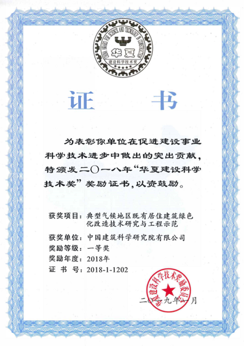中國建筑科學研究院有限公司深圳分公司與上海市建筑科學研究院(集團)有限公司、哈爾濱工業大學共同完成的“十二五”國家科技支撐計劃課題《典型氣候地區既有居住建筑綠色化改造技術研究與工程示范》榮獲2018年華夏建設科學技術獎一等獎。