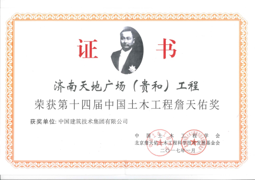 4月14日,第十四屆中國土木工程詹天佑獎(jiǎng)?lì)C獎(jiǎng)大會(huì)在北京舉行。中技集團(tuán)建筑設(shè)計(jì)院設(shè)計(jì)三所設(shè)計(jì)的濟(jì)南天地廣場(貴和)項(xiàng)目榮獲“第十四屆中國土木工程詹天佑獎(jiǎng)”。